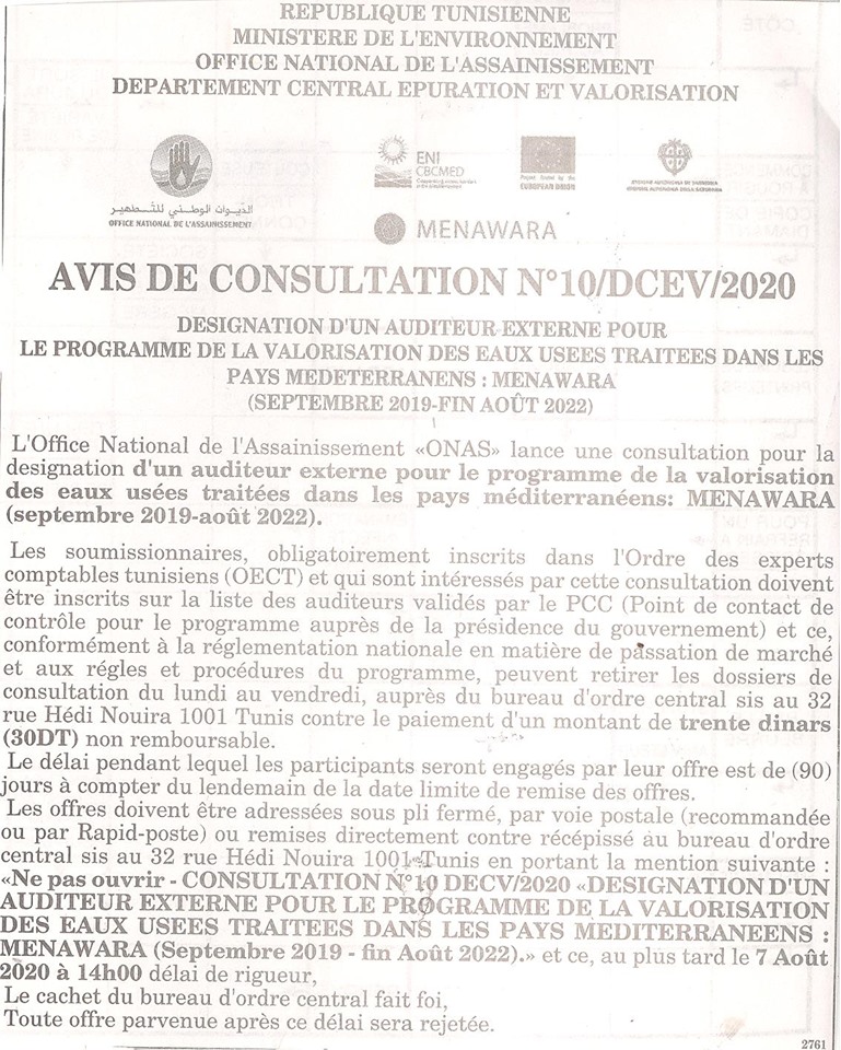 L'Office National de l'Assainissement informe les bureaux d'études ayant téléchargé ou retiré le dossier ou ceux intéressés par à l'Appel à manifestation d'intérêt no P03/2023 , relatif à « Mission d'assistance et d'accompagnement de l'ONAS pour la gestion des contrats de concession « Tunis-Nord » et « Sud de la Tunisie », que la date limite de remise des dossiers de candidature, prévue pour le 04 Avril 2023 est reportée au 18 avril 2023 à 10h00 (heure locale).